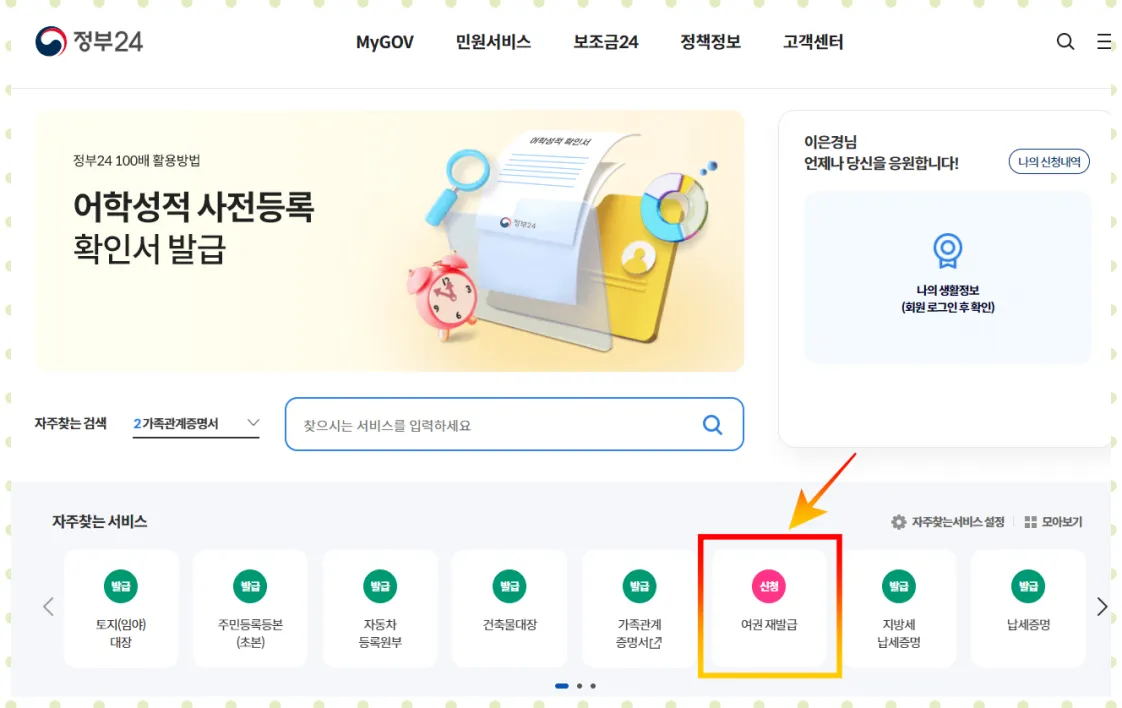 정부24에서 여권 재발급 신청 가능합니다.