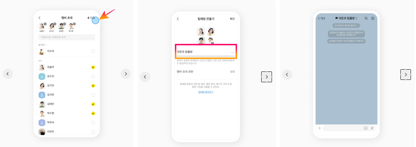 기존 팀원들을 찾아가면서 팀원들을 초대하고 팀 채팅방을 새롭게 개설하려면 힘드실텐데요. 기존 팀원 그대로 팀 채팅방으로 변경할 수 있습니다. 아래 화면 순서대로 팀 채팅방으로 변경해주세요.
