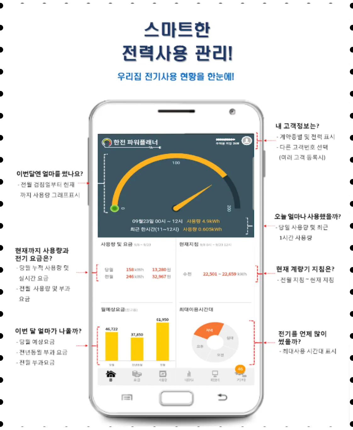 '한전ON' 또는 '한전 파워플래너' 앱에서 실시간 사용량과 요금까지 확인 가능합니다.