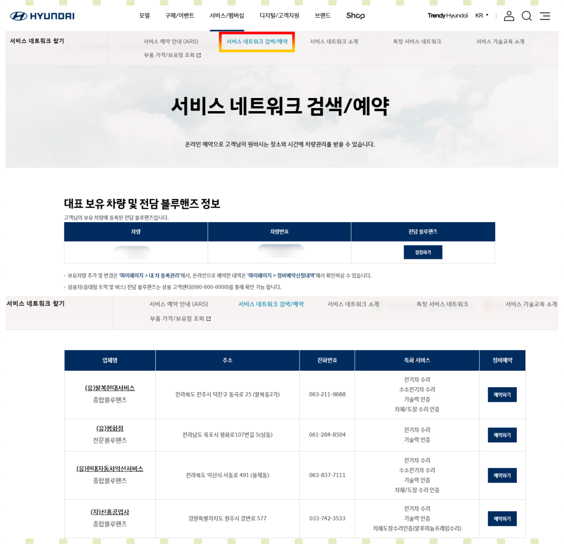 3. 서비스/멤버십 탭에서 '서비스 네트워크 검색/예약'화면에서 예약합니다.